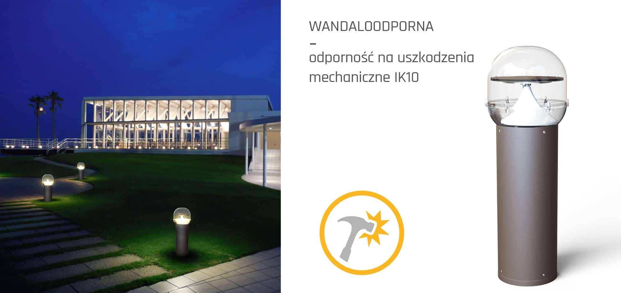 Solarna lampa projektowa SLP-1BUL LED o strumieniu świetlnym 300lm z obrotowym panelem solarnym to idealne oświetlenie do zastosowania zarówno w miejskich jak i przydomowych przestrzeniach. SLP-01BUL to połączenie energii słonecznej, oświetlenia LED i wydajnych akumulatorów. Lampa została skonstruowana tak by osiągnąć jak najwyższą odporność na wandalizm – IK10 sprawia to, że jest praktycznie niezniszczalna. Do tego wysoka wodoodporność na poziomie IP66 to gwarancja, że lampa bezproblemowo przetrwa nawet najtrudniejsze warunki atmosferyczne.